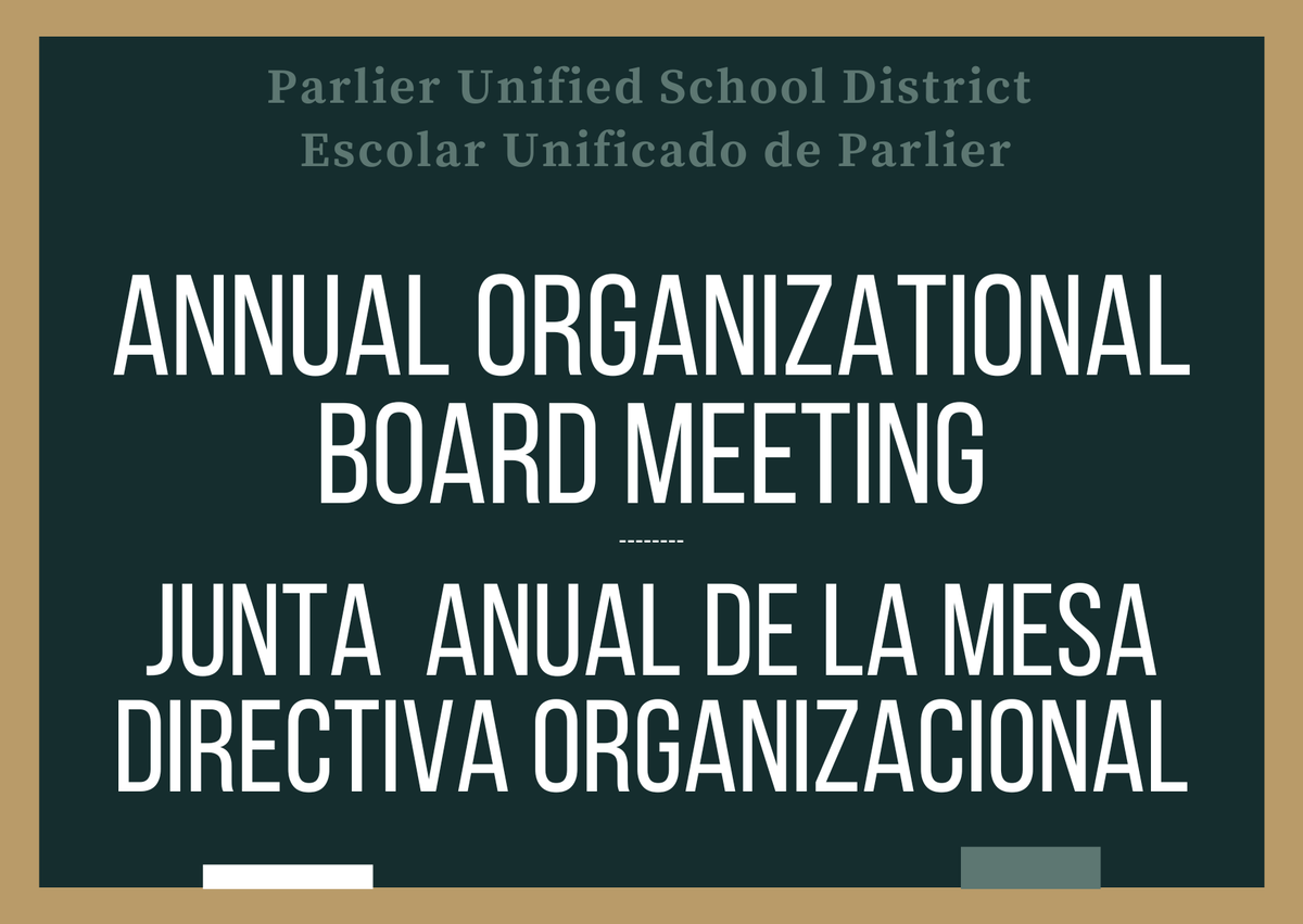 La próxima Reunión Anual Organizacional de la Mesa Directiva se llevará a cabo el martes, 16 de diciembre de 2025, a las 6:00 p.m. en la Sala de la Mesa Directiva, ubicada en el campus de la Escuela Secundaria Parlier (Parlier Junior High School).