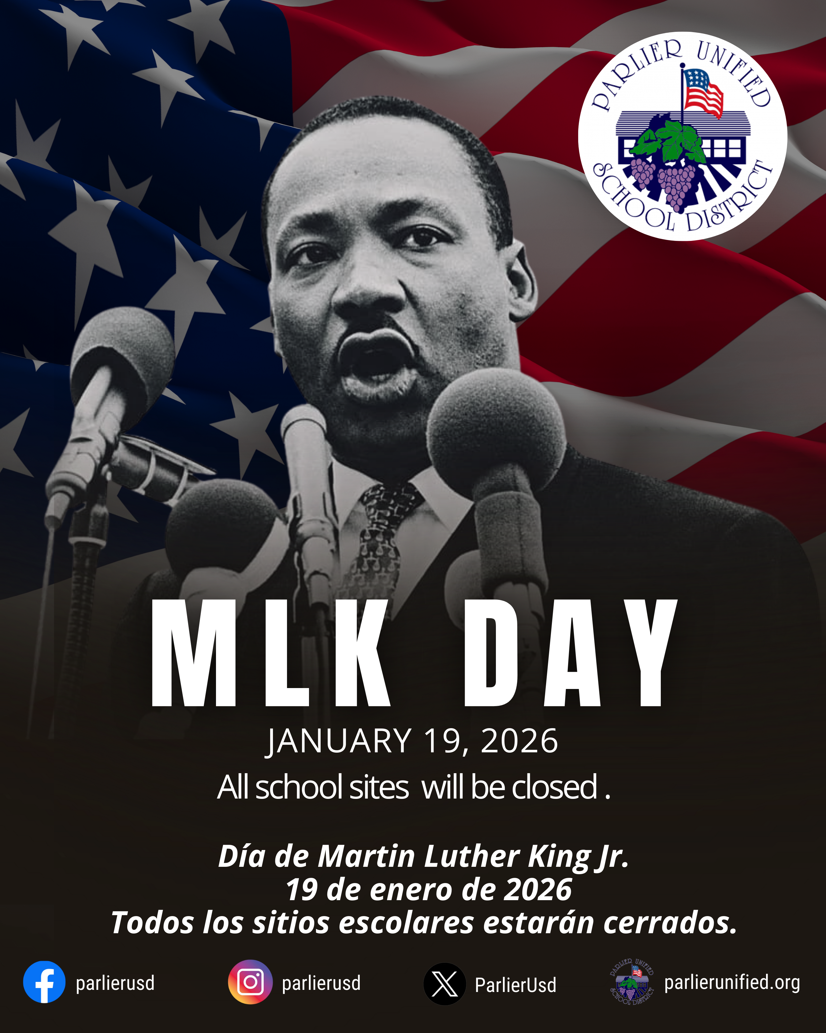 Parlier Unified School District will observe Martin Luther King Jr. Day on Monday, January 19, 2026. All school sites will be closed. Classes will resume on Tuesday, January 20, 2026. As we honor Dr. King’s legacy, we reflect on his message of service, justice, and unity.